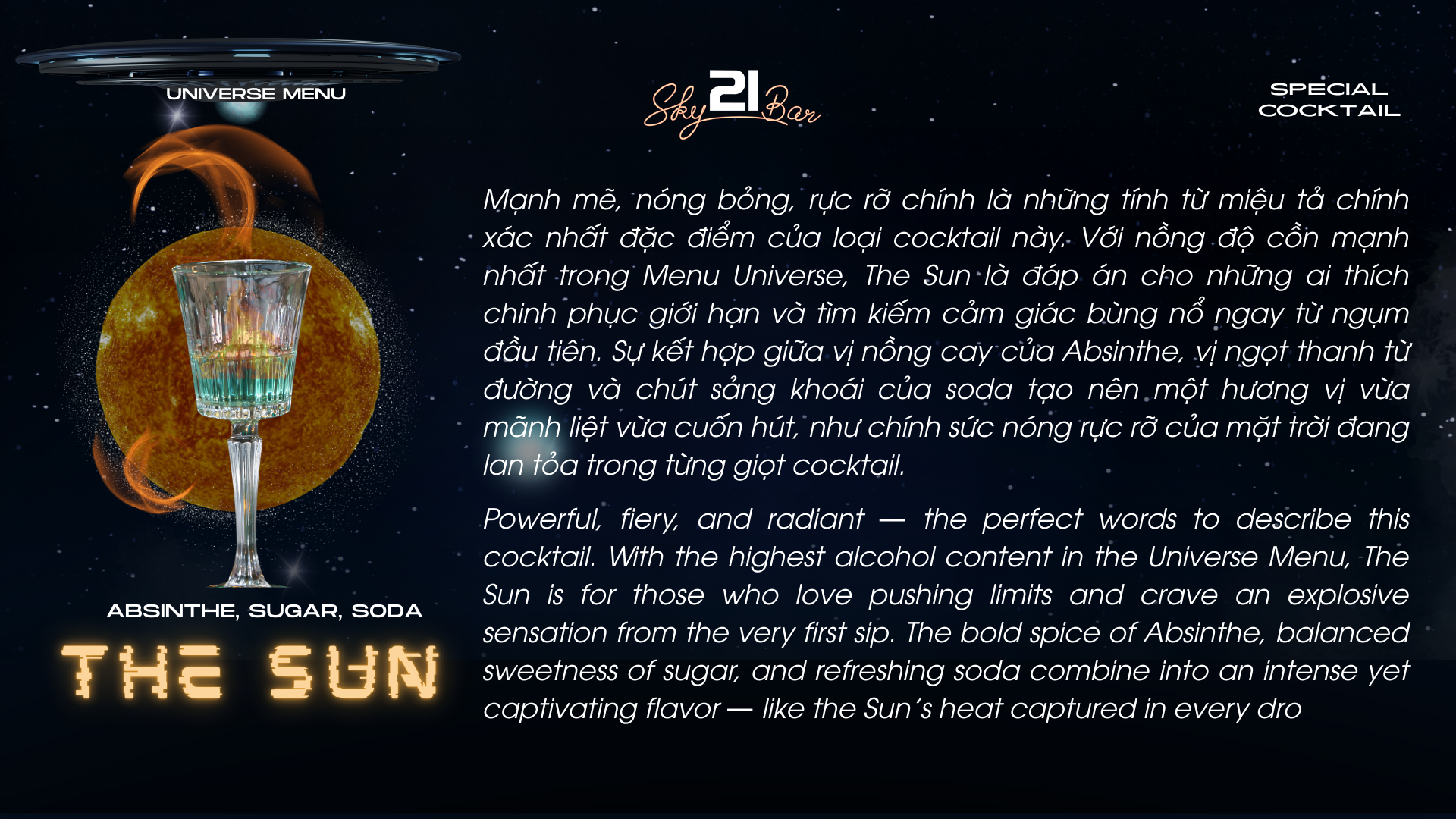 - Powerful, fiery, and radiant — the perfect words to describe this cocktail. With the highest alcohol content in the Universe Menu, The Sun is for those who love pushing limits and crave an explosive sensation from the very first sip. The bold spice of Absinthe, balanced sweetness of sugar, and refreshing soda combine into an intense yet captivating flavor — like the Sun’s heat captured in every drop.