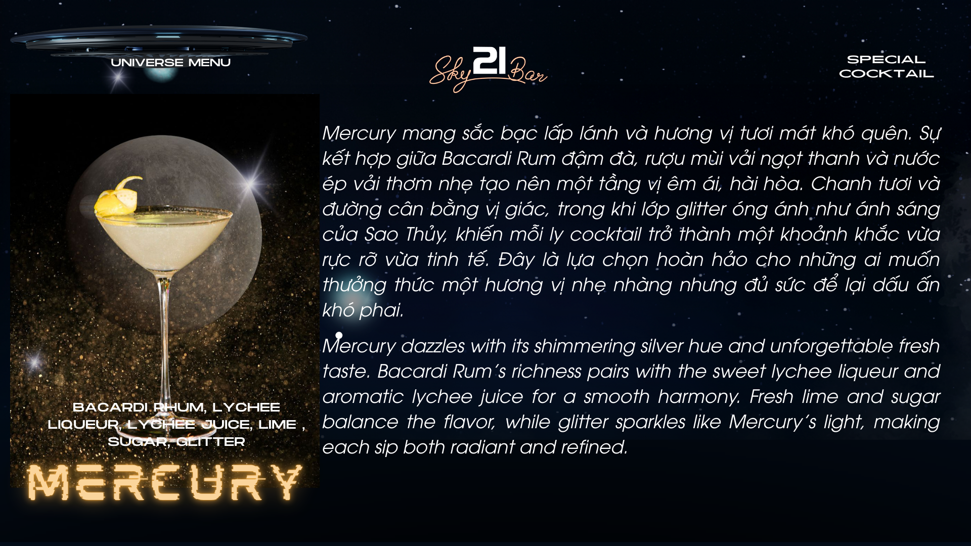 - Mercury dazzles with its shimmering silver hue and unforgettable fresh taste. Bacardi Rum’s richness pairs with the sweet lychee liqueur and aromatic lychee juice for a smooth harmony. Fresh lime and sugar balance the flavor, while glitter sparkles like Mercury’s light, making each sip both radiant and refined.