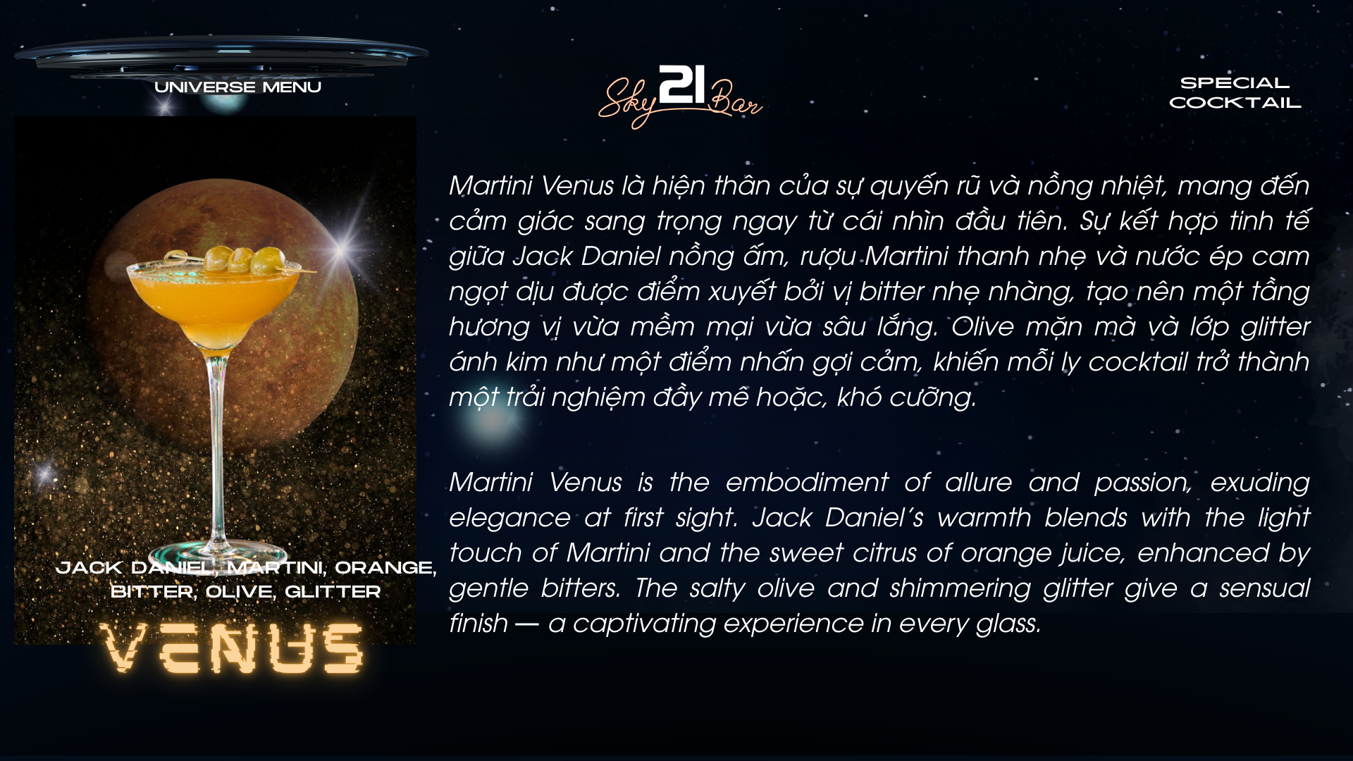 - Martini Venus is the embodiment of allure and passion, exuding elegance at first sight. Jack Daniel’s warmth blends with the light touch of Martini and the sweet citrus of orange juice, enhanced by gentle bitters. The salty olive and shimmering glitter give a sensual finish — a captivating experience in every glass.