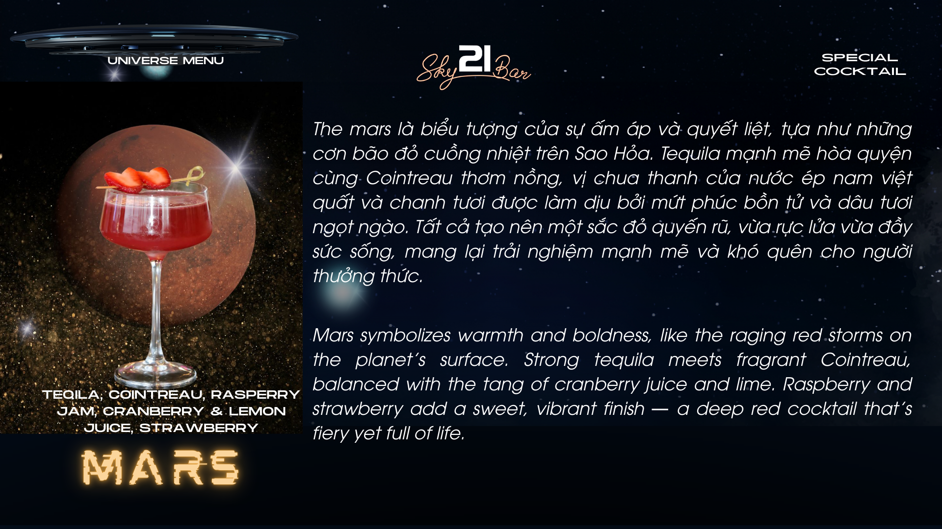 - Mars symbolizes warmth and boldness, like the raging red storms on the planet’s surface. Strong tequila meets fragrant Cointreau, balanced with the tang of cranberry juice and lime. Raspberry and strawberry add a sweet, vibrant finish — a deep red cocktail that’s fiery yet full of life.