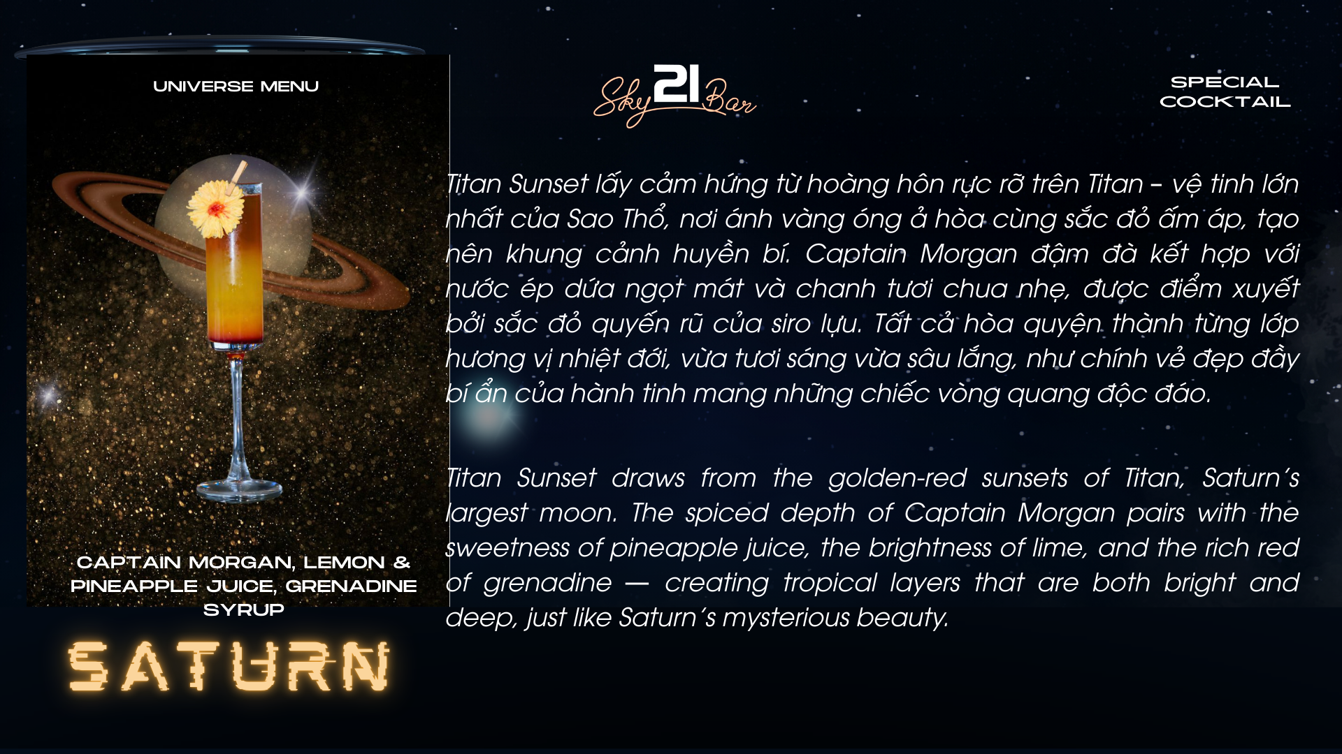 - Titan Sunset draws from the golden-red sunsets of Titan, Saturn’s largest moon. The spiced depth of Captain Morgan pairs with the sweetness of pineapple juice, the brightness of lime, and the rich red of grenadine — creating tropical layers that are both bright and deep, just like Saturn’s mysterious beauty.