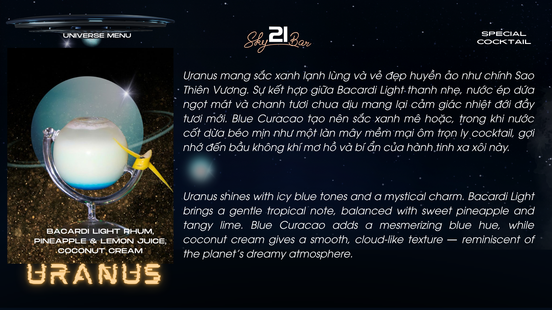 - Uranus shines with icy blue tones and a mystical charm. Bacardi Light brings a gentle tropical note, balanced with sweet pineapple and tangy lime. Blue Curacao adds a mesmerizing blue hue, while coconut cream gives a smooth, cloud-like texture — reminiscent of the planet’s dreamy atmosphere.
